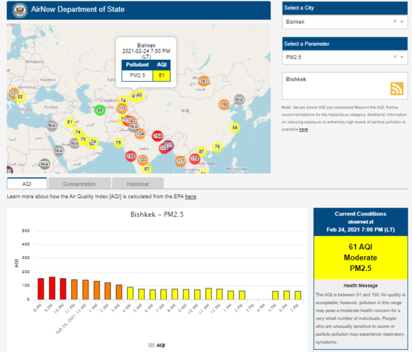 Посольство США в Кыргызстане также установило датчик. Информация обновляется каждый час. На 19.00 индекс качества воздуха в районе дипломатической миссии — 61 (AQI).