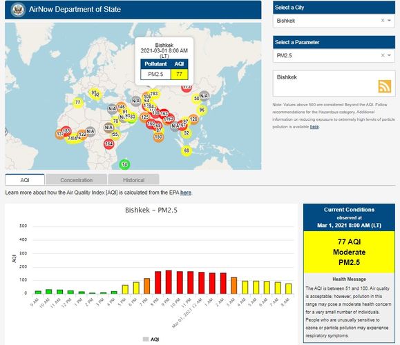 Посольство США в Кыргызстане также установило датчик. Информация обновляется каждый час. На 8.00 индекс качества воздуха в районе дипломатической миссии — 77 (AQI).