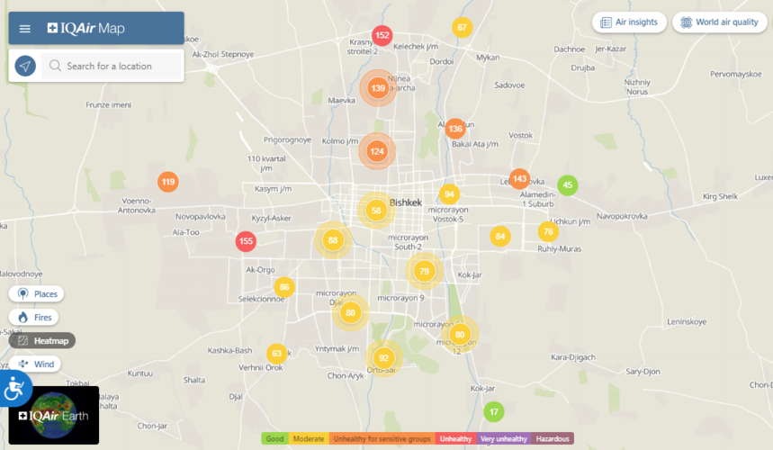 Общественный фонд «Институт экологических решений» установил датчики в столице и пригороде. На карте можно увидеть среднее значение AQI в разных районах Бишкека. Его обновляют ежечасно.