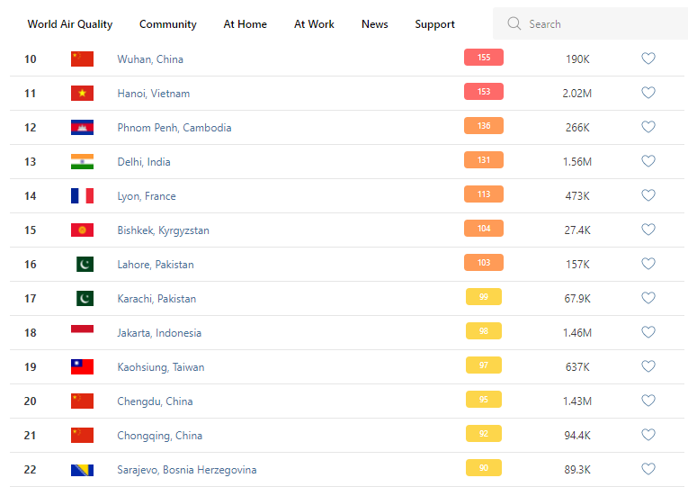 В рейтинге крупнейших городов мира по качеству воздуха World Air Quality Бишкек поднялся на 15-е место.