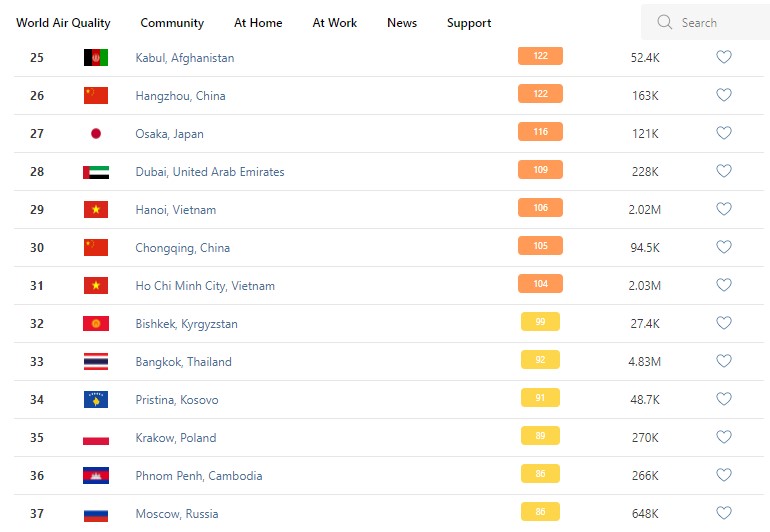 В рейтинге крупнейших городов мира по качеству воздуха World Air Quality Бишкек опустился на 32-е место.