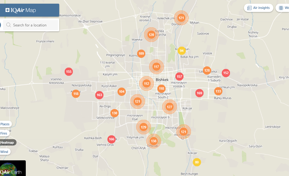 Общественный фонд «Институт экологических решений» установил датчики в столице и пригороде. На карте можно увидеть среднее значение AQI в разных районах Бишкека. Его обновляют ежечасно.