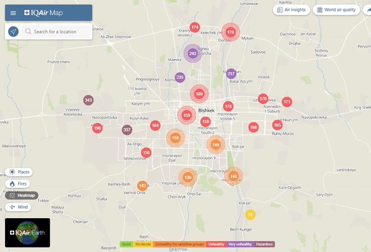 Общественный фонд «Институт экологических решений» установил датчики в столице и пригороде. На карте можно увидеть среднее значение AQI в разных районах Бишкека. Его обновляют ежечасно.