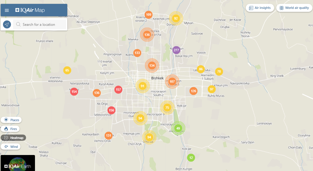 В рейтинге крупнейших городов мира по качеству воздуха World Air Quality Бишкек опустился на 29-е место.