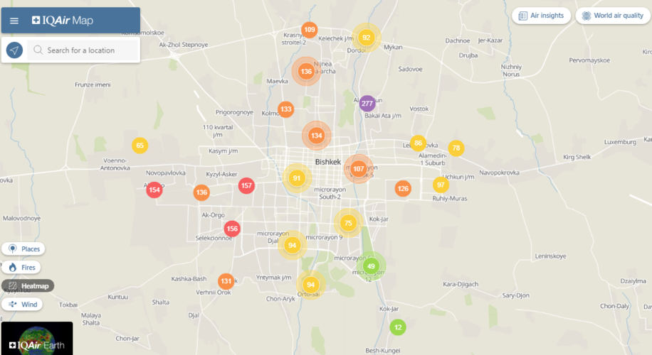 Общественный фонд «Институт экологических решений» установил датчики в столице и пригороде. На карте можно увидеть среднее значение AQI в разных районах Бишкека. Его обновляют ежечасно.