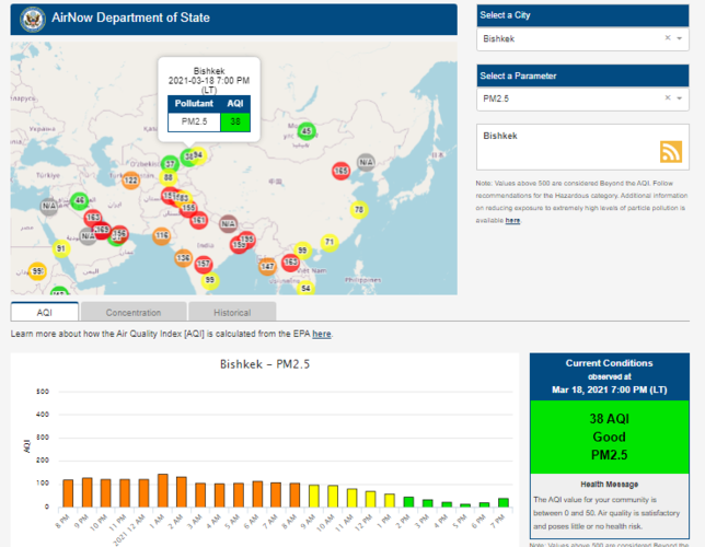 Посольство США в Кыргызстане также установило датчик. Информация обновляется каждый час. На 19.00 индекс качества воздуха в районе дипломатической миссии — 38 (AQI).