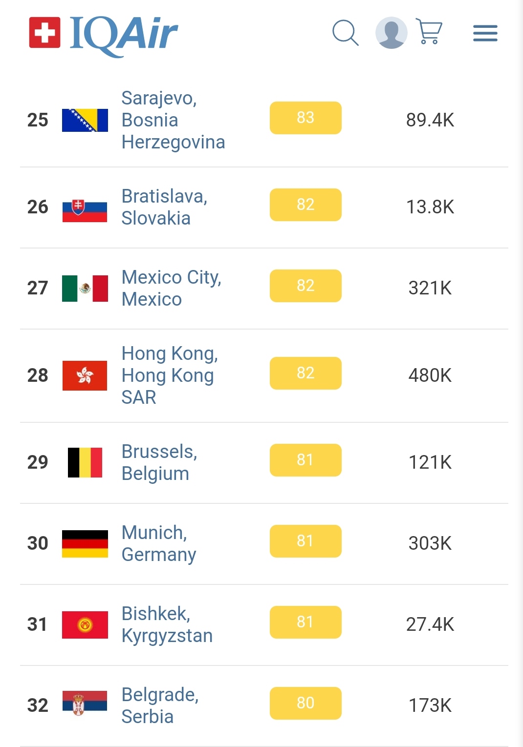 В рейтинге крупнейших городов мира по качеству воздуха World Air Quality Бишкек опустился на 31-е место.