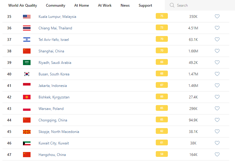 В рейтинге крупнейших городов мира по качеству воздуха World Air Quality Бишкек поднялся на 42-е место.