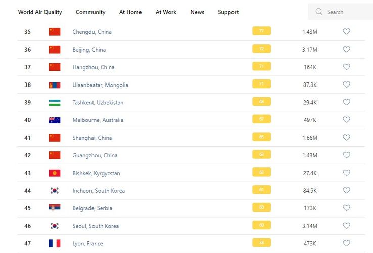 В рейтинге крупнейших городов мира по качеству воздуха World Air Quality Бишкек опустился на 43-е место.