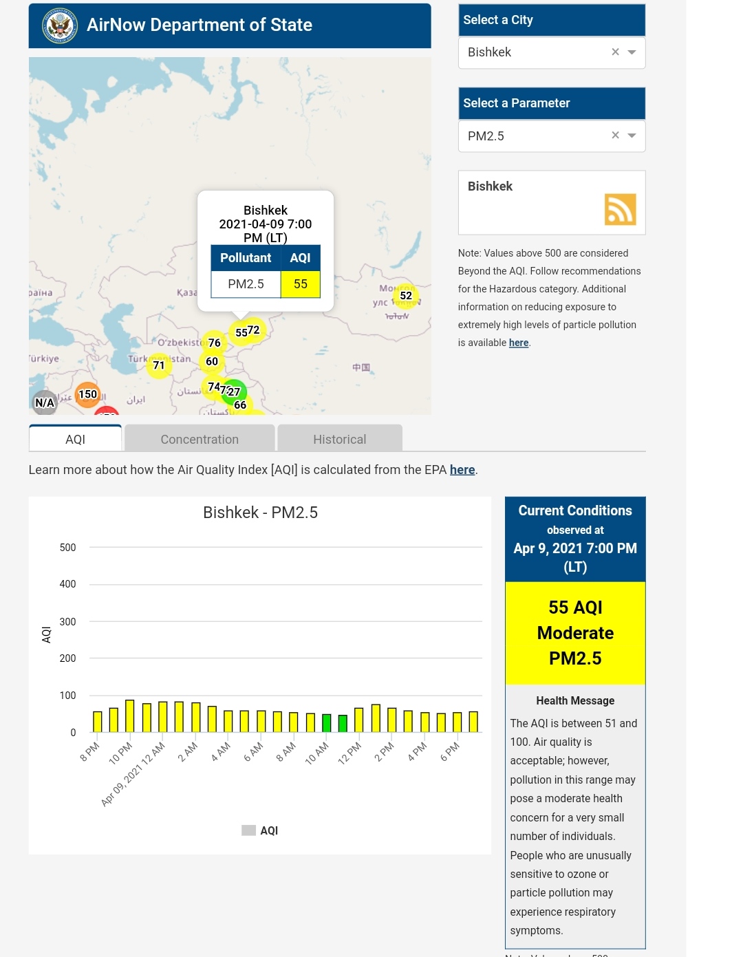 Посольство США в Кыргызстане также установило датчик. Информация обновляется каждый час. На 19.00 индекс качества воздуха в районе дипломатической миссии — 55 (AQI).