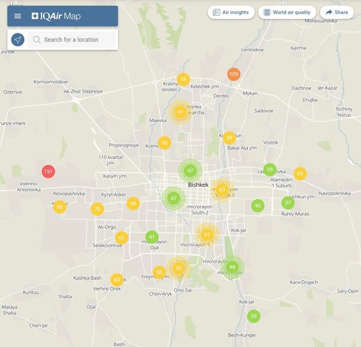 Общественный фонд «Институт экологических решений» установил датчики в столице и пригороде. На карте можно увидеть среднее значение AQI в разных районах Бишкека. Его обновляют ежечасно.