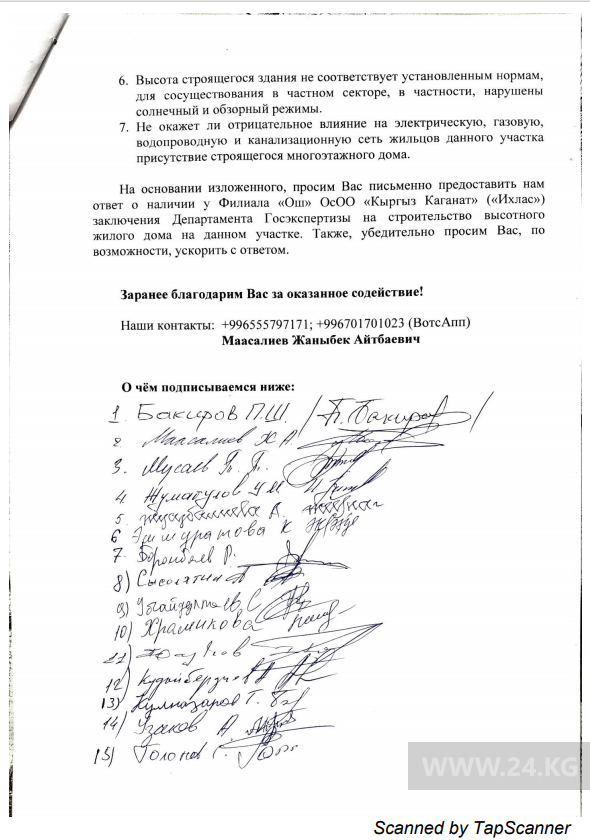 «Мы являемся смежными соседями с территорией, где начато строительство многоэтажного жилого дома. Обращались в мэрию, управление архитектуры, Экотехинспекцию и прокуратуру с просьбой проверить законность строительства», — говорит житель Оша.