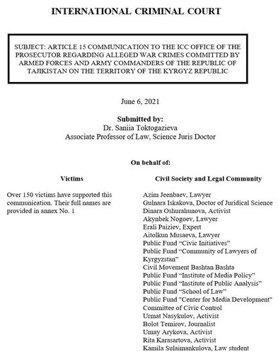 «Пользуясь правом, регламентированным статьей 15 Римского статута, от имени жертв и гражданского общества я направила communication (обращение) прокурору Международного уголовного суда с просьбой инициировать расследование согласно статье 53 Римского статута в отношении военнослужащих и главнокомандующих Таджикистана по факту совершения военных преступлений против мирного населения Кыргызской Республики», — отметила Сания Токтогазиева.