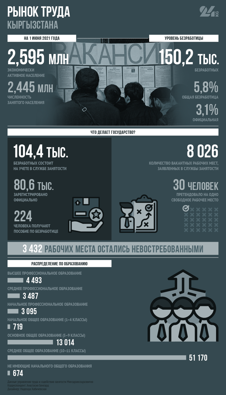 По статистике на 1 января 2021 года уровень официально зарегистрированной безработицы составил 3 процента. Самый высокий показатель зафиксирован в Джалал-Абадской (5,9 процента) и Баткенской (5,2 процента) областях, самый низкий — в Чуйской области (1,3 процента).