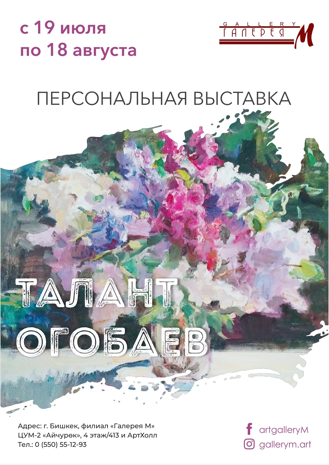 В Бишкеке в «Галерее М» с 19 июня по 18 августа пройдет персональная выставка Таланта Огобаева. Об этом 24-kg.com сообщили ее организаторы. В экспозиции представлено более 30 живописных натюрмортов известного художника.
