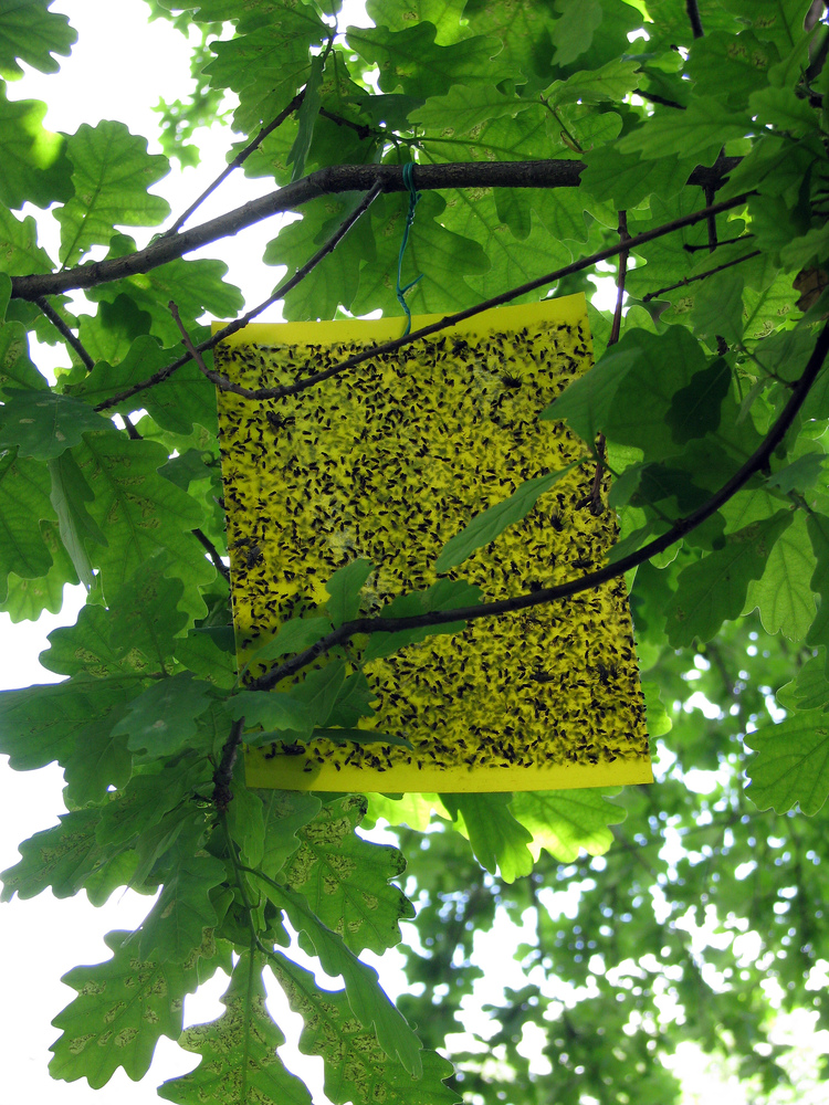 Конечно, больше двух третей налипших на них букашек — это дубовый и вязовый минирующие пилильщики. Случайно налипшие. Но в июне они уже не летают, некоторые личинки собрались уходить в почву. Зачем же эти желтые листки висят до Нового года? Ведь они продолжают уничтожать других насекомых, включая полезных. А феромоны зачем? Это ведь в подавляющем большинстве случаев «духи», которые секретируются самками для привлечения самцов. Но у дубового и вязового минирующих пилильщиков нет самцов.