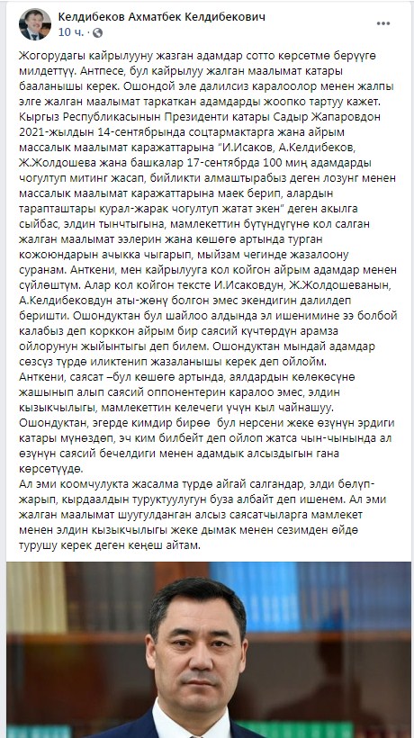 Отметим, что сам Ахматбек Келдибеков, чье имя упоминается в обращении, на своей странице в Facebook указал, что намерен подать в суд на авторов. Политик считает, что письмо, направленное на имя президента, — политическая игра перед выборами.