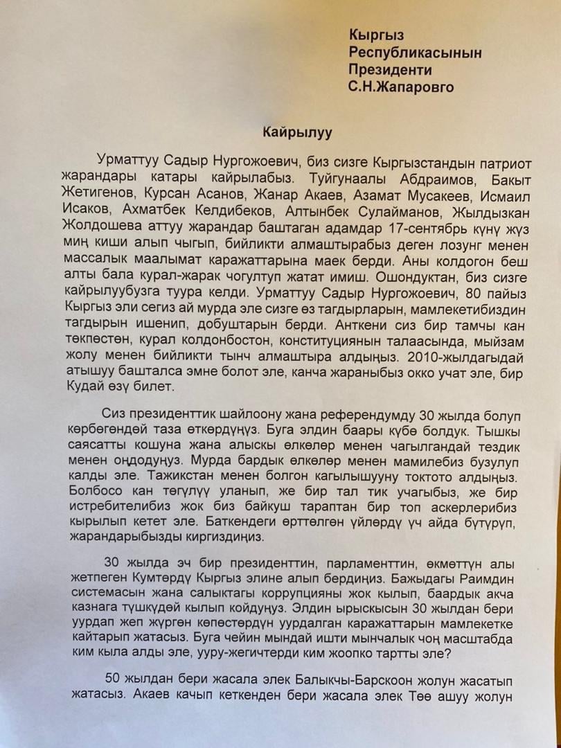 В конце текста обратившиеся пишут: «Что им (политикам. — Прим. 24-kg.com) еще надо? Уважаемый Садыр Нуркожоевич, не играйте с ними в кошки-мышки. За вами стоит 80-90 процентов людей. Если надо, вас поддержат так, как и в 2016 году люди поддержали Эрдогана. Примите к ним жесткие меры. Не будьте мягким, иначе мы потеряем страну».