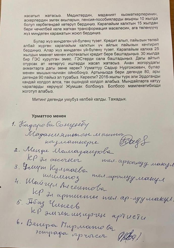 Обращение к главе государства подписали: отличник культуры Сонунбубу Кадырова, эстрадная певица Венера Пирматова. Поэтесса Менди Мамазаирова, народная артистка Шайгул Алсеитова, ученый Умут Култаева и заслуженный артист Абаз Чикеев якобы дали свое согласие по телефону.
