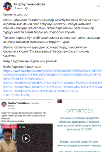 В связи с этим Айсулуу Тыныбекова призвала кыргызстанцев пожаловаться на фейковую страницу Aisulluu Tynybekkova в Facebook, перейдя по ссылке.