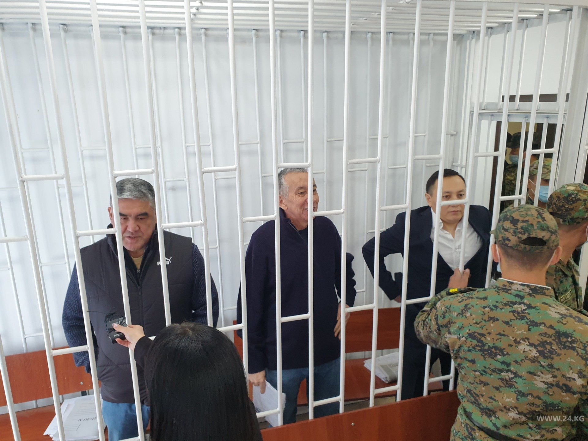 В зал суда под конвоем доставлены экс-замминистра внутренних дел Курсан Асанов, лидер партии «Туран» Жениш Молдокматов и экс-руководитель аппарата президента Фарид Ниязов.