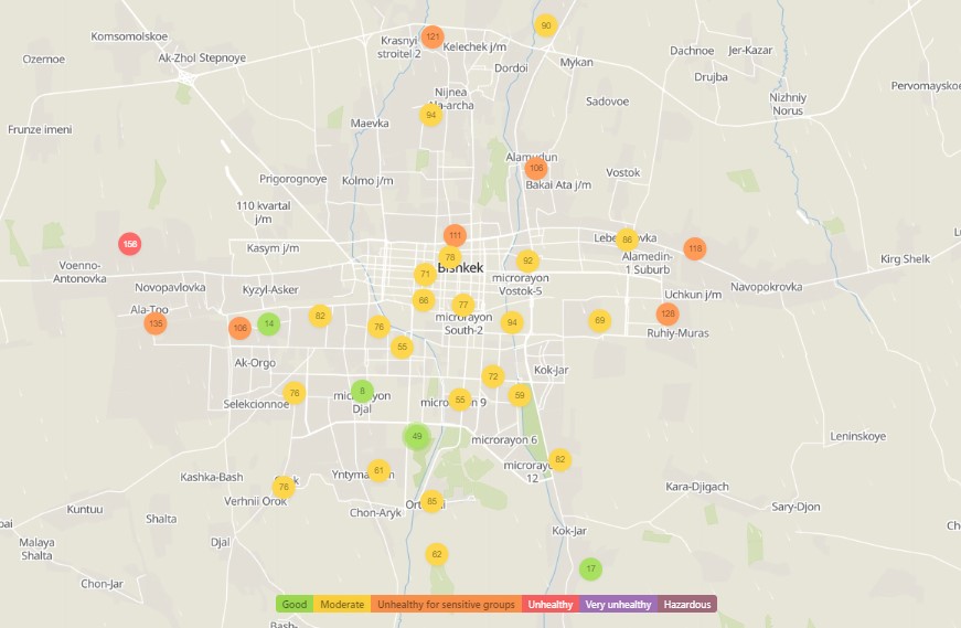 Общественный фонд «Институт экологических решений» установил датчики в столице и пригороде. На карте можно увидеть среднее значение AQI в разных районах Бишкека. Его обновляют ежечасно.