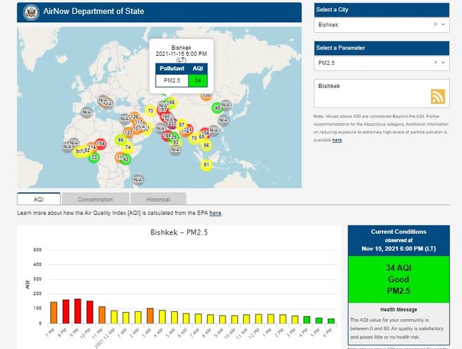 Посольство США в Кыргызстане также установило датчик. Информация обновляется каждый час. Индекс качества воздуха в районе дипломатической миссии «хороший» — 34 (AQI).