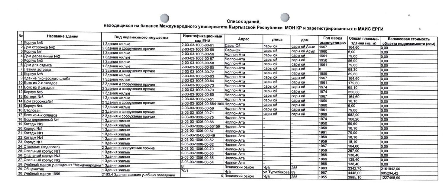 По их данным, из 30 объектов недвижимости вуза, примерно половина оказалась в частных руках. Например, среди новых владельцев обнаружился брат депутата Бакыта Торобаева, брат еще одного нардепа Азамата Арапбаева и бывший зампред Госкомитета по недропользованию Азизбек Ороков.