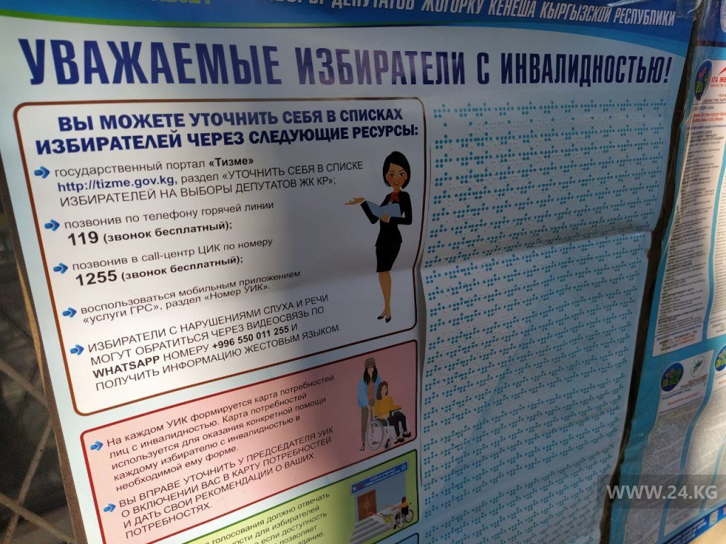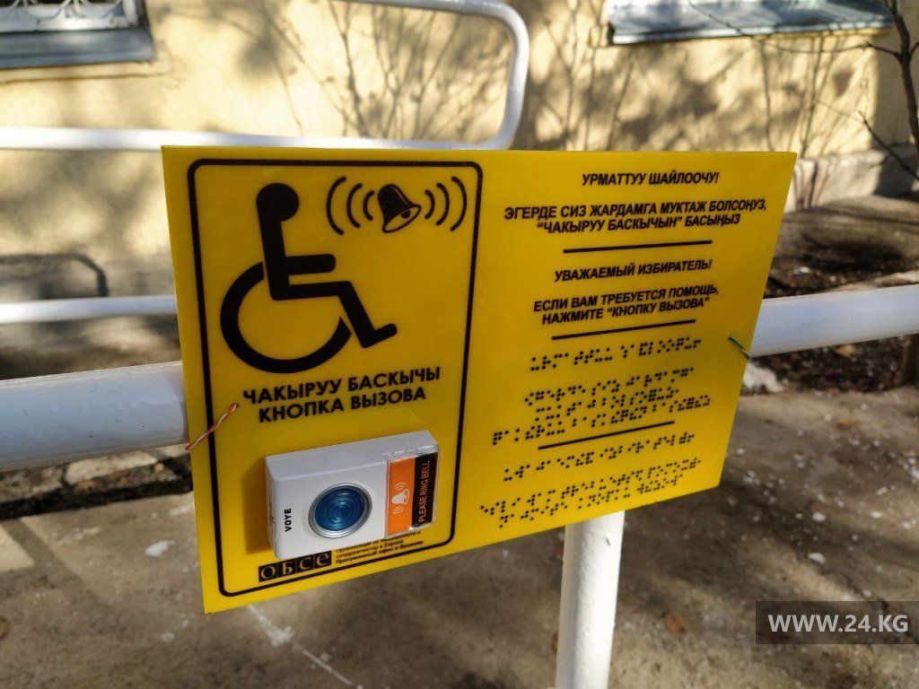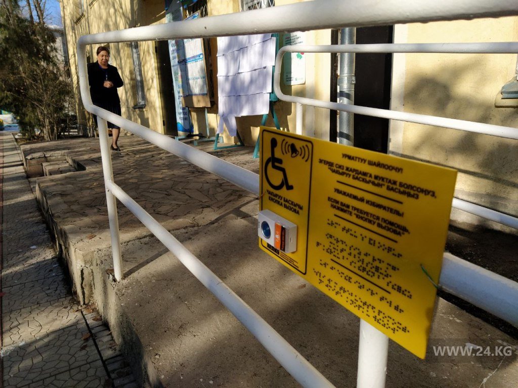Интересный факт — это один из участков в Бишкеке, на котором созданы условия для избирателей с инвалидностью. У входа установлены специальный пандус и кнопка вызова сотрудника УИК. При необходимости человек может обратиться за помощью. Проверили — работает.