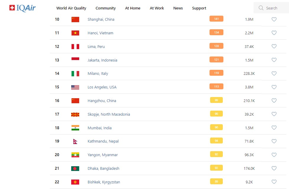 В рейтинге крупнейших городов мира по качеству воздуха World Air Quality Бишкек поднялся на 22-е место.