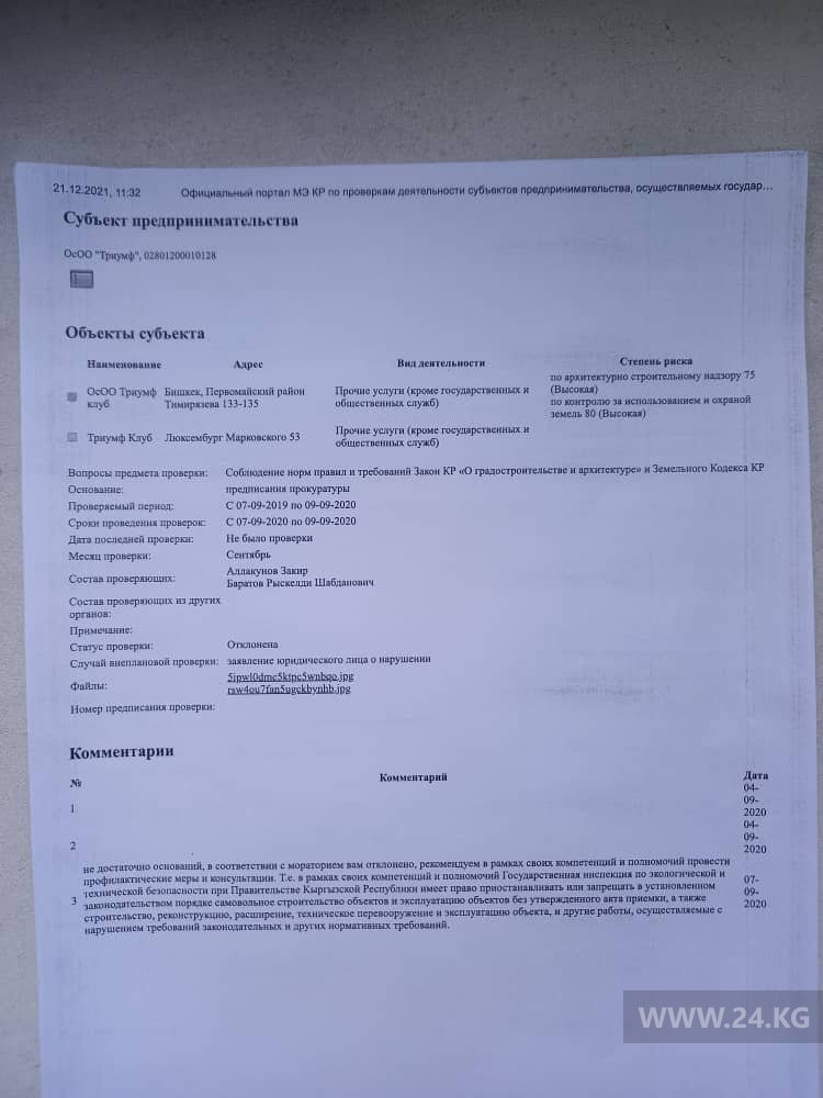 По словам главного архитектора Первомайского района Шергазы Джумашева, «Триумф клуб» ведет бизнес без разрешительных документов. Объект не соответствует требованиям строительных норм и правил.«Бишкекглавархитектура не имеет права выдавать разрешительные документы подобным объектам. От компании к нам никто не приходил. Но мы выяснили, что цех построили в жилом квартале самовольно. В таких районах запрещено организовывать подобный бизнес. Это опасно. Мы бы никогда не выдали разрешение», — говорит Шергазы Джумашев.