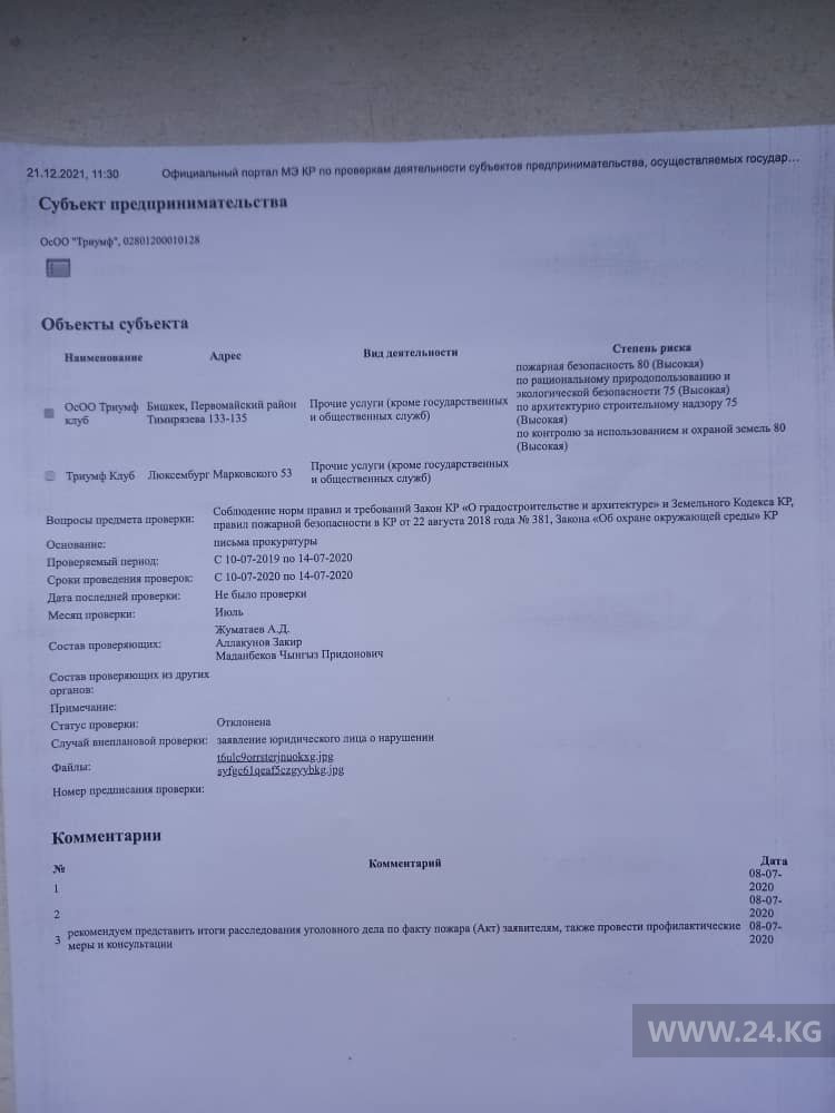 В Государственную инспекцию по экологической и технической безопасности поступило не одно письмо от жителей улицы Тимирязева с жалобой на ОсОО «Триумф клуб». Они просили проверить и закрыть кустарное производство.Начальник управления инспекции по пожарной безопасности по Бишкеку и Чуйской области Салмоорбек Карагулов отметил, что после обращения жителей Госэкотехинспекция неоднократно обращалась в Минэкономики с просьбой провести внеплановую проверку объекта. Все обращения министерство отклонило.