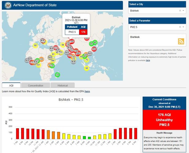 Посольство США в Кыргызстане также установило датчик. Информация обновляется каждый час. Индекс качества воздуха в районе дипломатической миссии — 176 (AQI).
