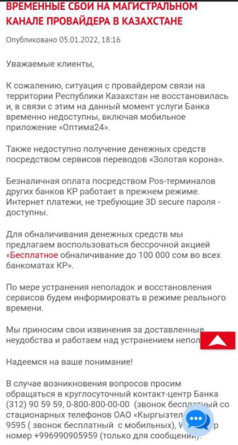 Отмечается, что не работает также и мобильное приложение «Оптима24». Это связано с волнениями в Казахстане.