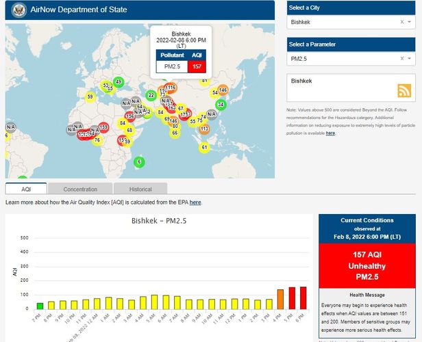 Посольство США в Кыргызстане также установило станцию. Информация обновляется каждый час. Индекс качества воздуха в районе дипломатической миссии — 157 (AQI).