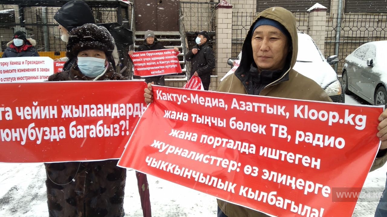 Участники, которые сегодня устроили акцию протеста возле офиса Kaktus.media, перебазировались. Собравшиеся по-прежнему требуют объявить иностранными агентами Kaktus.media, Kloop и «Азаттык». Они называют эти редакции дестабилизаторами жизни кыргызстанцев.