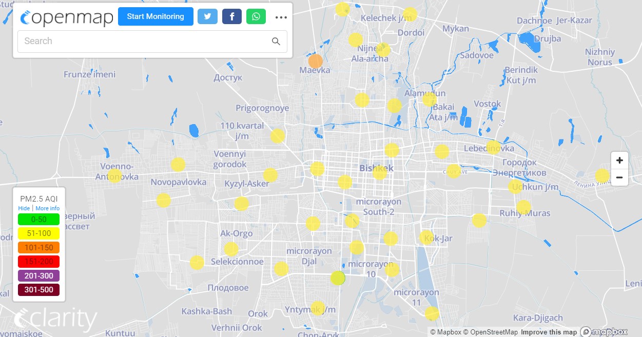 Посольство США в Кыргызстане также установило станцию. Информация обновляется каждый час. Индекс качества воздуха в районе дипломатической миссии — 72 (AQI).