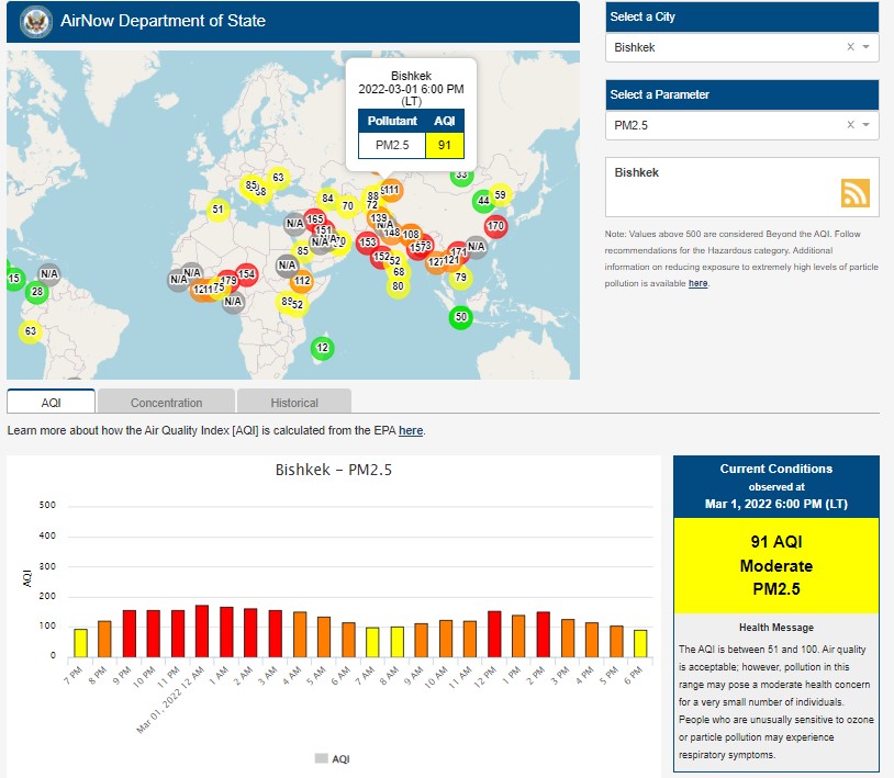 Посольство США в Кыргызстане также установило станцию. Информация обновляется каждый час. Индекс качества воздуха в районе дипломатической миссии — 91 (AQI).