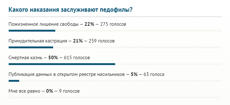 За жесткую меру наказания высказалась половина респондентов, принявших участие в голосовании. Еще 22 процента считают приемлемым для насильников над детьми пожизненное лишение свободы. Почти столько же проголосовали за принудительную кастрацию. При этом 5 процентов респондентов выступили за публикацию личных данных насильников в открытом реестре.