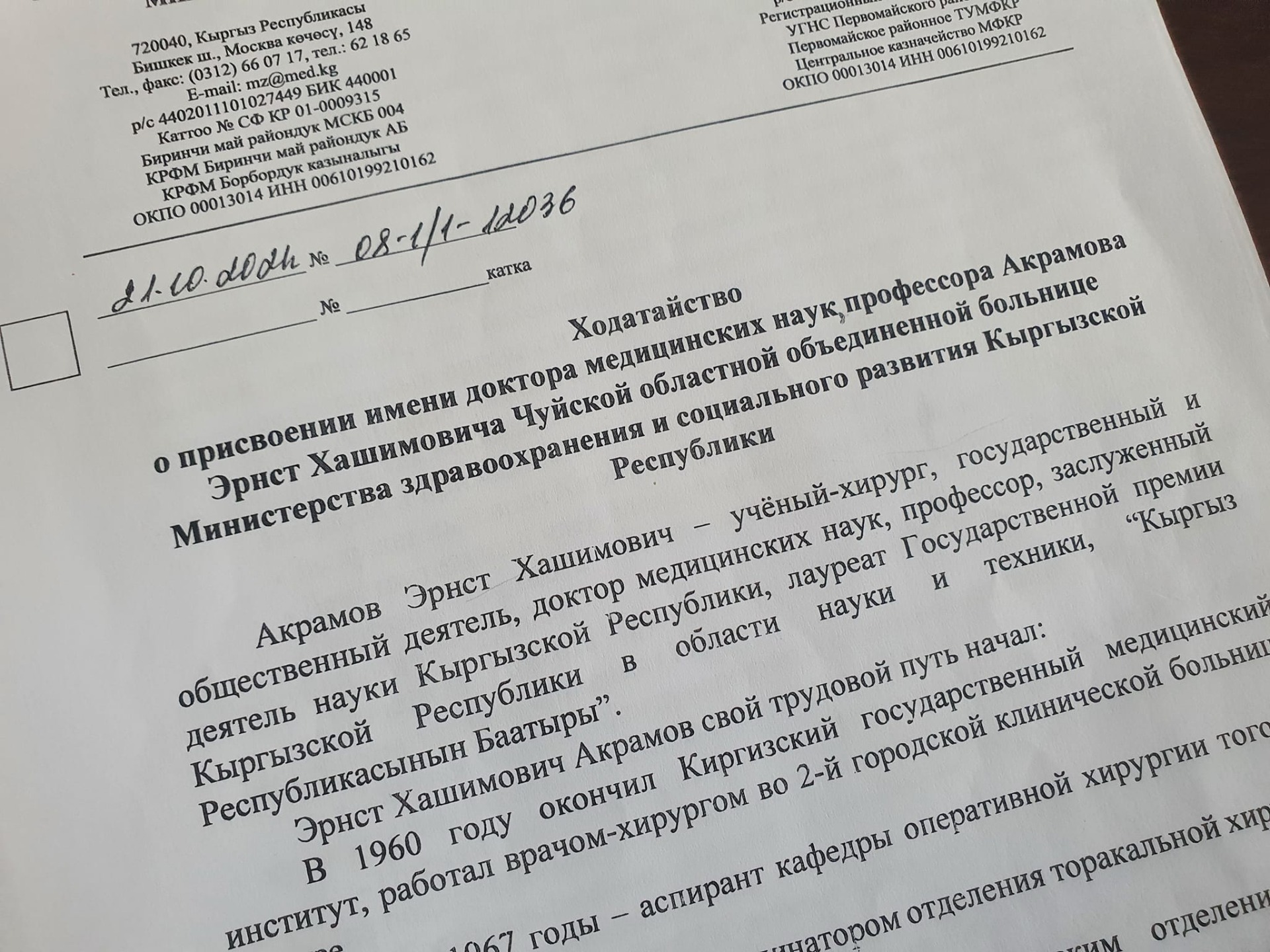 Министр здравоохранения Алымкадыр Бейшеналиев подписывал в прошлом году ходатайство о присвоении имени Эрнста Акрамова Чуйской областной объединенной больнице. Фотографию выложила на своей странице медиаэксперт в области медицины Елена Баялинова.