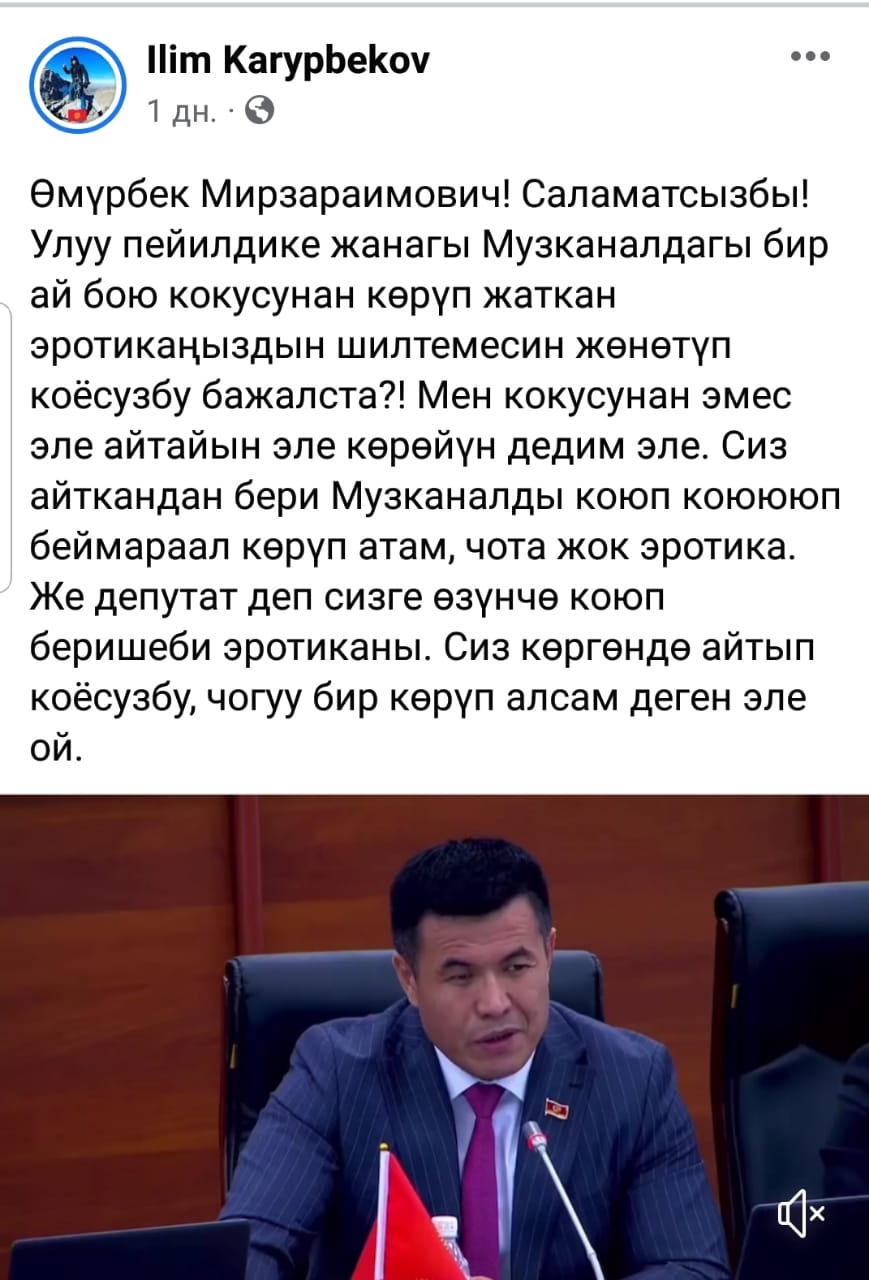 «Пожалуйста, отправьте мне ссылку на ту эротику, которую вы случайно целый месяц смотрели в эфире ОТРК. При этом я не буду случайно, а специально посмотрю. Так как после вашего заявления я стал включать музканал, но никакой эротики пока не вижу. Хотя, может, вам, как депутату, специально ставят эротику. У меня к вам просьба: когда увидите эротику, мне скажите, вместе посмотрим», — написал Илим Карыпбеков.