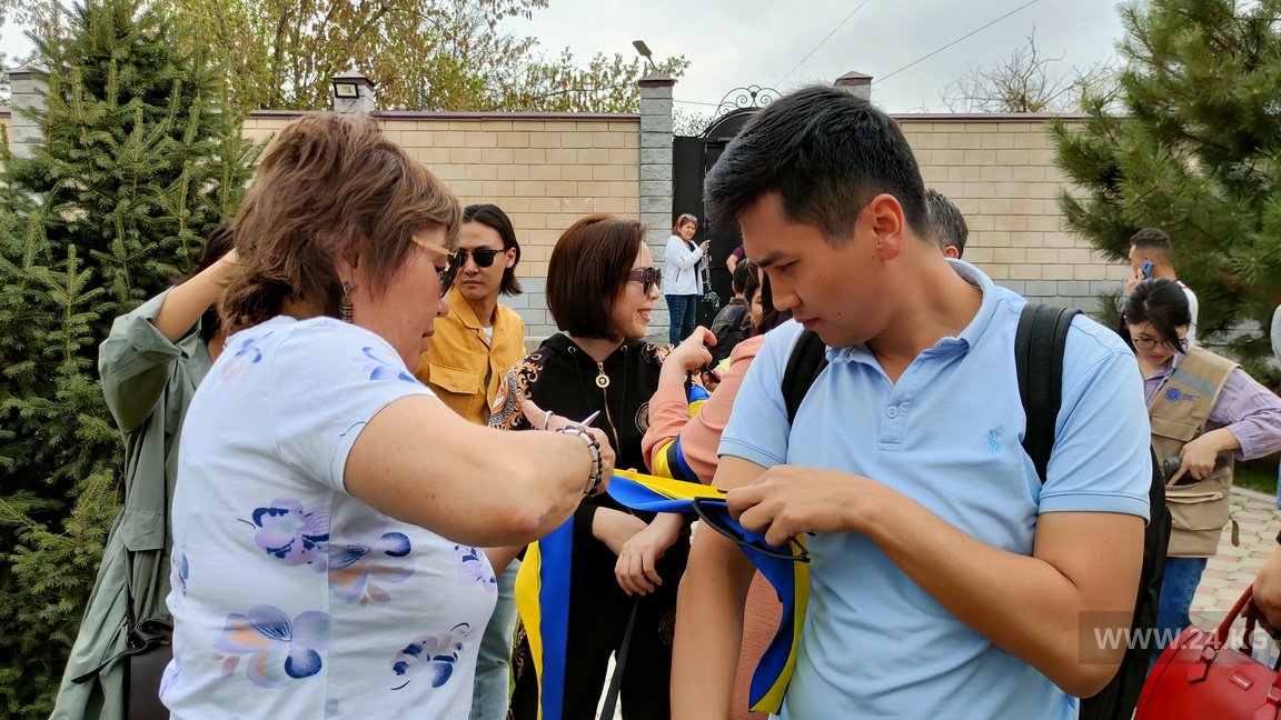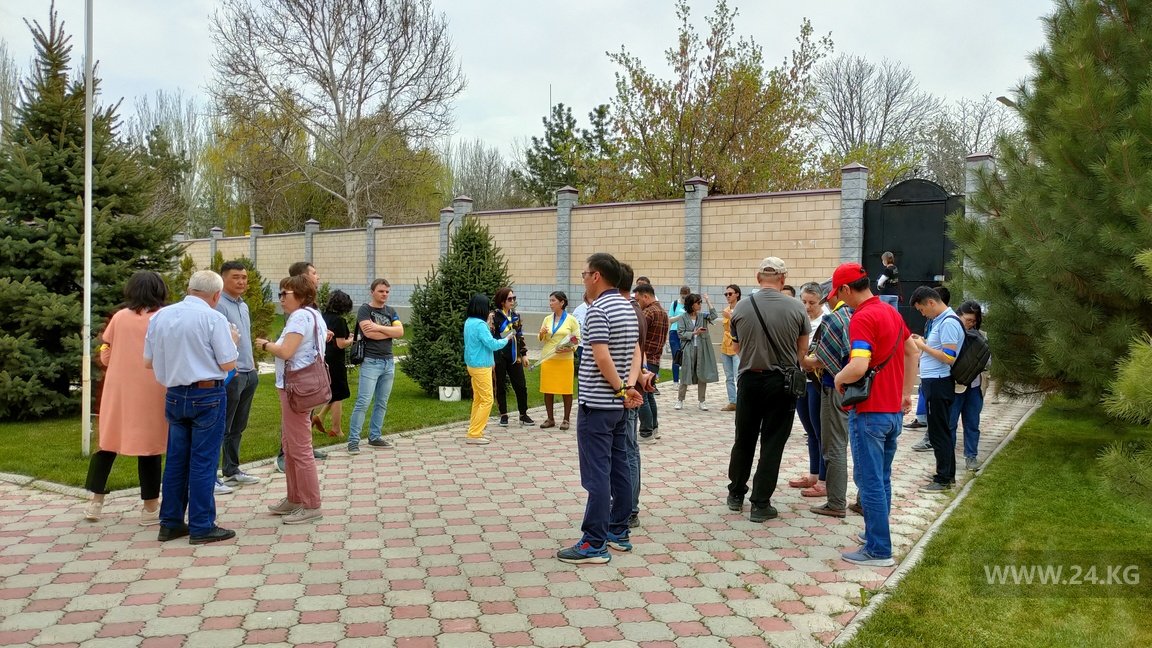 Примерно 30 человек зашли во двор диппредставительства и выразили слова соболезнования украинскому народу. К собравшимся вышел посол Украины в Кыргызстане Валерий Жовтенко.