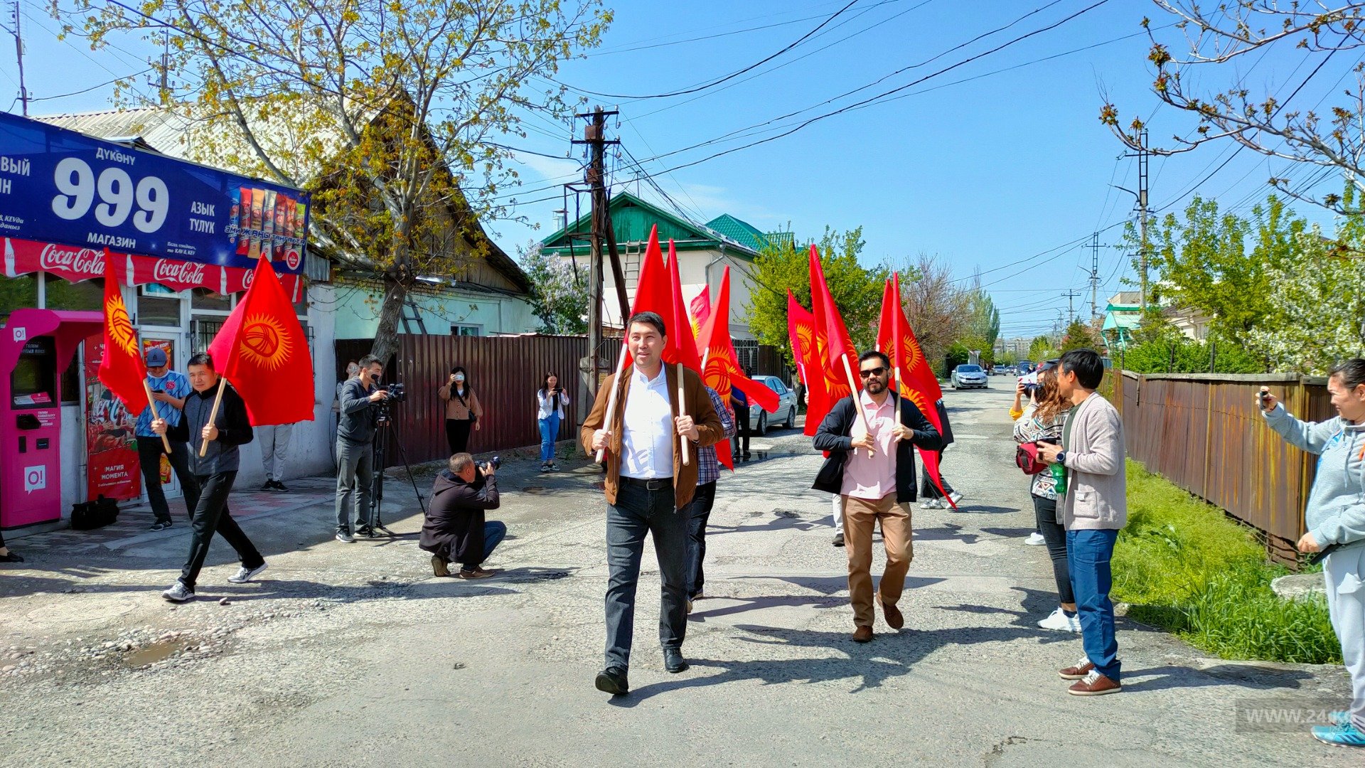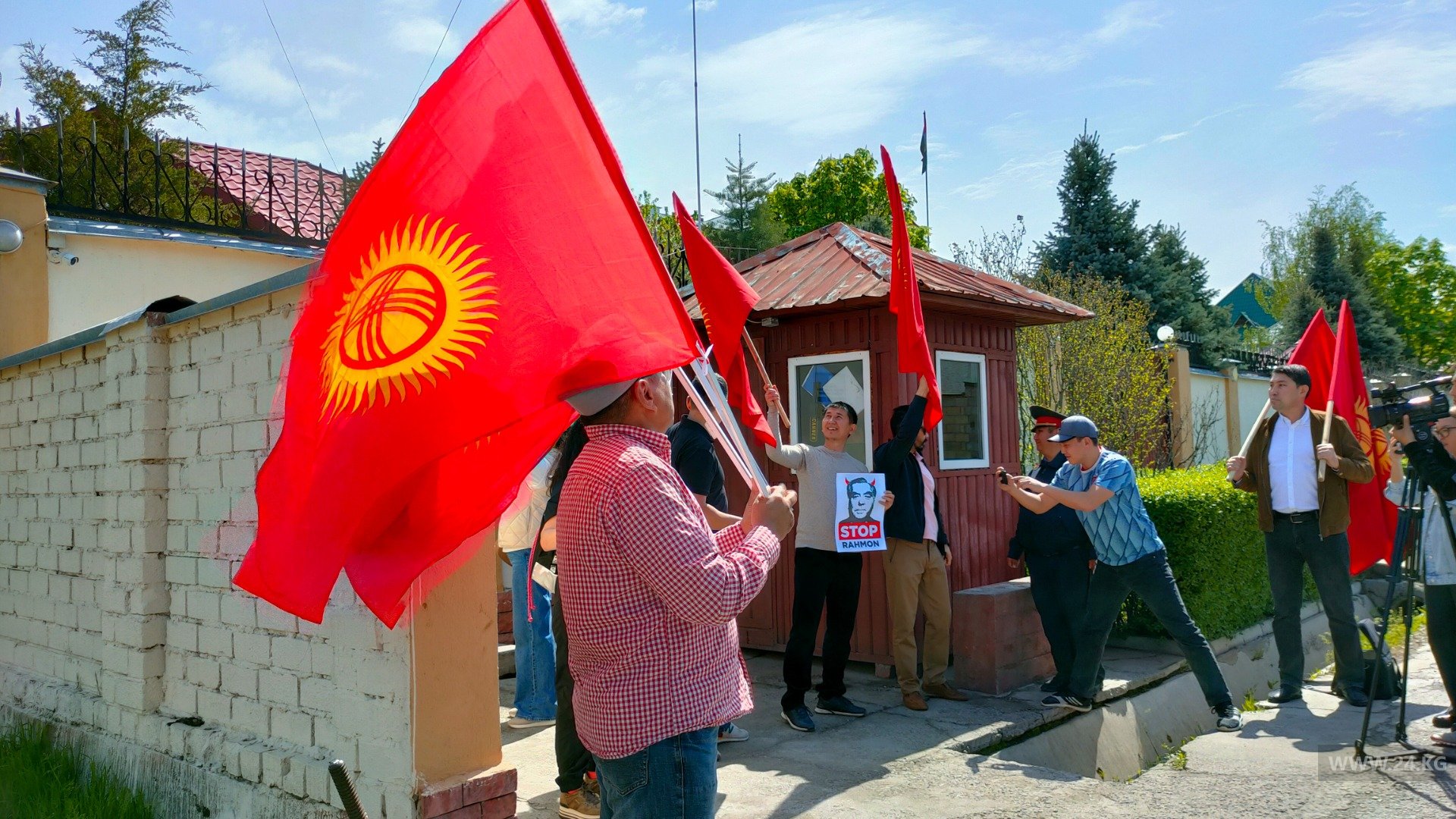 На митинг вышли примерно 20 человек. Они призывают Таджикистан прекратить агрессию в Баткенской области. Участники держат плакаты с надписями: «Баткен — наша земля!», «Стоп, Рахмон, агрессор».