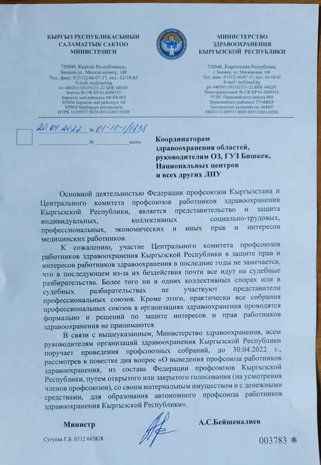 Министр здравоохранения Алымкадыр Бейшеналиев подписал очередной указ, вызвавший в медицинских кругах недоумение. Он распорядился до 30 апреля провести собрания профсоюзов и рассмотреть вопрос выведения Профсоюза работников здравоохранения из состава Федерации профсоюзов Кыргызстана.