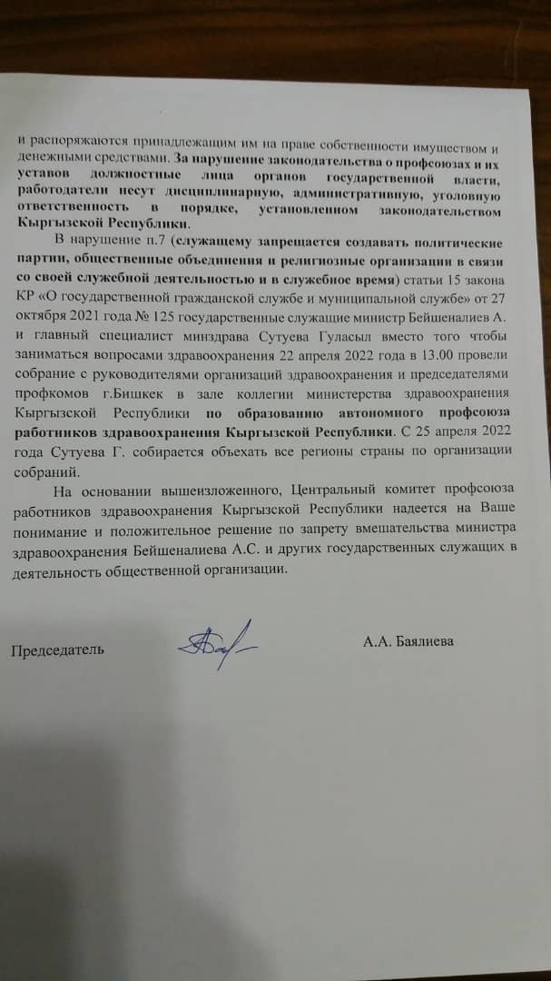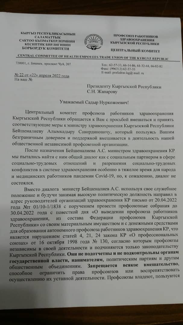 «Но 22 апреля госслужащие — министр Алымкадыр Бейшеналиев и главный специалист Минздрава Гуласыл Сутуева провели собрание с руководителями и председателями профкомов организаций здравоохранения Бишкека по образованию автономного профсоюза», — отмечается в письме.