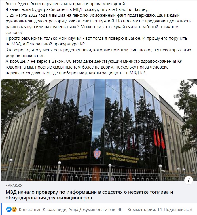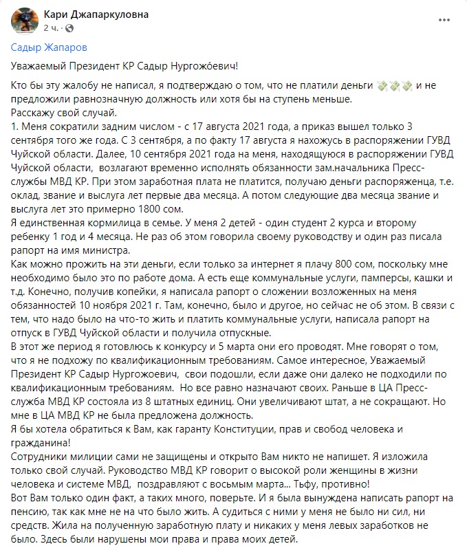 «Меня сократили задним числом — с 17 августа 2021 года, а приказ вышел только 3 сентября того же года. С 3 сентября, а по факту 17 августа, я находилась в распоряжении ГУВД Чуйской области. Далее 10 сентября 2021 года на меня, находящуюся в распоряжении ГУВД Чуйской области, возлагают временно исполнять обязанности замначальника пресс-службы МВД. При этом заработная плата не платится, получаю деньги распоряженца, то есть оклад, и надбавки за звание и выслугу лет первые два месяца. А потом следующие два месяца платили только надбавку — это примерно 1 тысяча 800 сомов», — написала она.