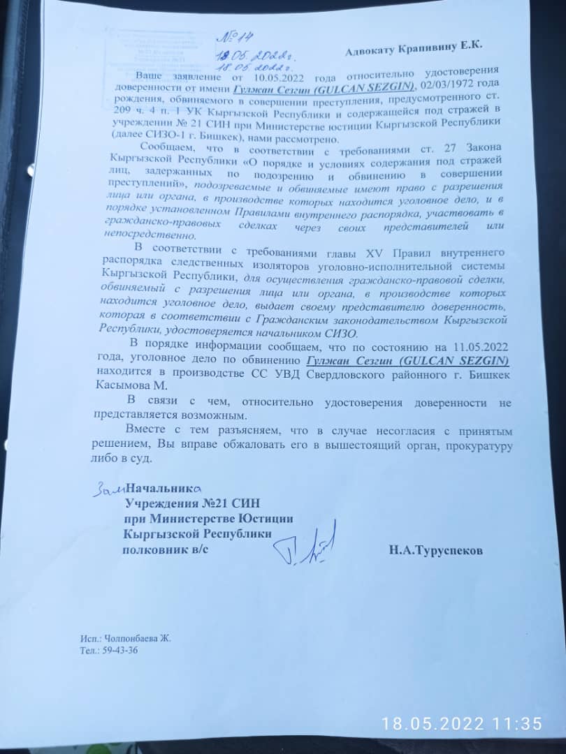 Адвокату Евгении Крапивиной отказывают в выдаче доверенности на ее подзащитного — гражданина Турции Гулжана Сезгина. Об этом она сама сообщила 24-kg.com.