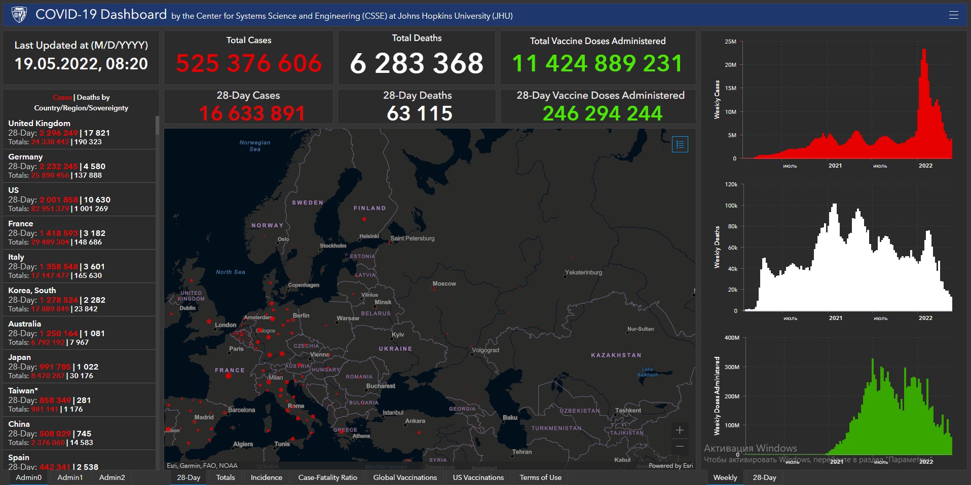 Всего в мире с начала пандемии коронавирусом заразились 525 миллионов 376 тысяч 606 человек. Больше всего в США (82 миллиона 951 тысяча 379), Индии (43 миллиона 127 тысяч 199), Бразилии (30 миллионов 701 тысяча 900), Франции (29 миллионов 489 тысяч 304), Великобритании (24 миллиона 330 тысяч 442), России (18 миллионов 7 тысяч 169), Турции (15 миллионов 58 тысяч 627), Аргентине (9 миллионов 135 тысяч 308), Иране (7 миллионов 229 тысяч 74), Колумбии (6 миллионов 95 тысяч 316), Испании (12 миллионов 179 тысяч 234), Италии (17 миллионов 147 тысяч 477) и Германии (25 миллионов 890 тысяч 456).