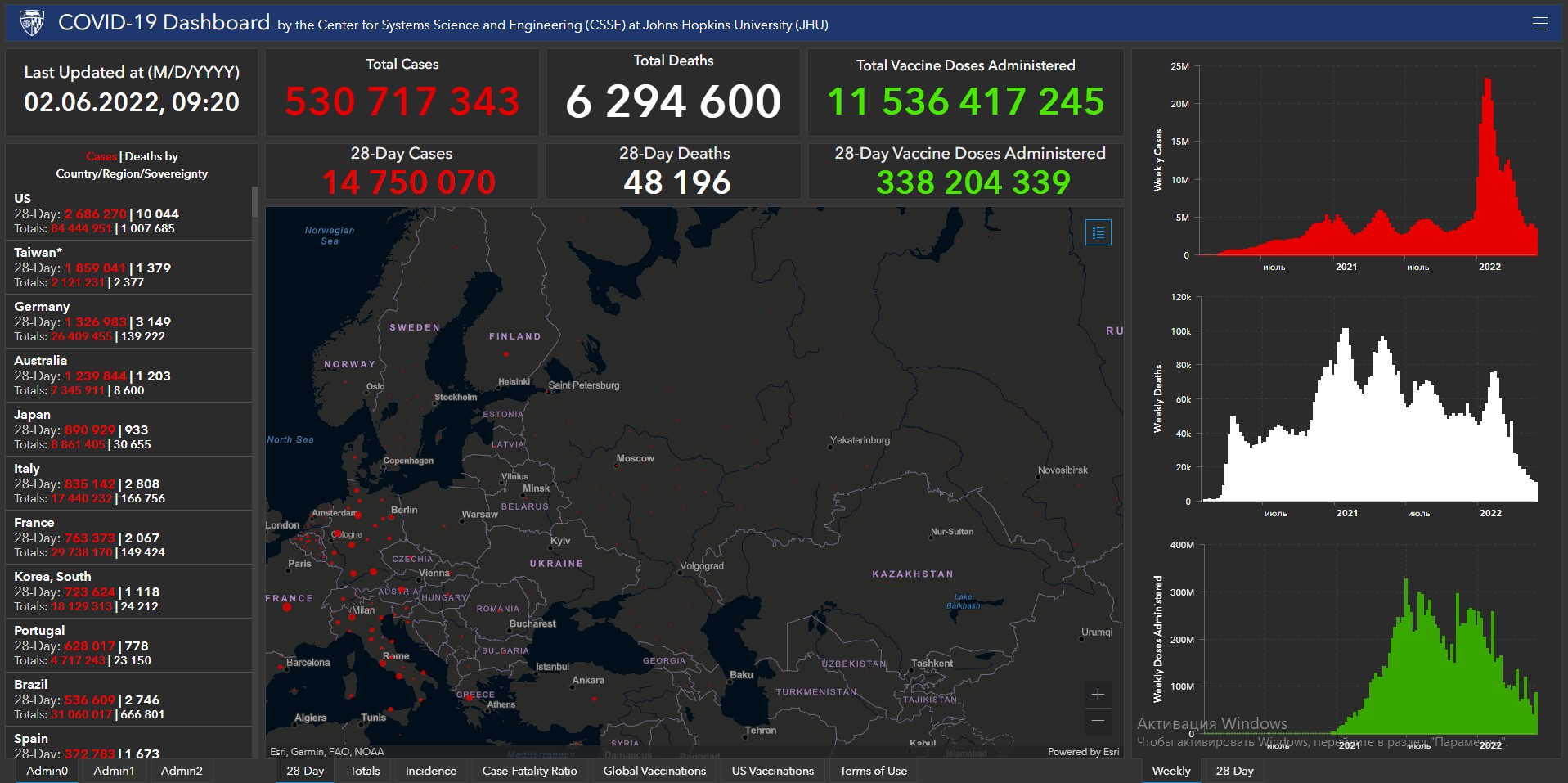 Всего в мире с начала пандемии коронавирусом заразились 530 миллионов 717 тысяч 343 человека. Больше всего в США (84 миллиона 444 тысячи 951), Индии (43 миллиона 160 тысяч 842), Бразилии (31 миллион 60 тысяч 17), Франции (29 миллионов 738 тысяч 170), Великобритании (22 миллиона 492 тысячи 903), России (18 миллионов 67 тысяч 977), Турции (15 миллионов 72 тысячи 747), Аргентине (9 миллионов 230 тысяч 573), Иране (7 миллионов 232 тысячи 34), Колумбии (6 миллионов 103 тысячи 455), Испании (12 миллионов 360 тысяч 256), Италии (17 миллионов 440 тысяч 232) и Германии (26 миллионов 409 тысяч 455).