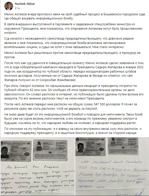 «Мелис Аспеков говорит, что, по официальным данным, кандидат в президенты потратил по Чуйской области 62 миллиона сомов. Он сообщал об этом правоохранительным органам, но дело заволокитили. Он сливал расписки в интернет, но публикации были удалены путем взлома его аккаунта. По его мнению, расписки тянут на импичмент президенту. Аспеков передал мне расписки на общую сумму $547 тысяч 500», — написал Нурбек Токтакунов.